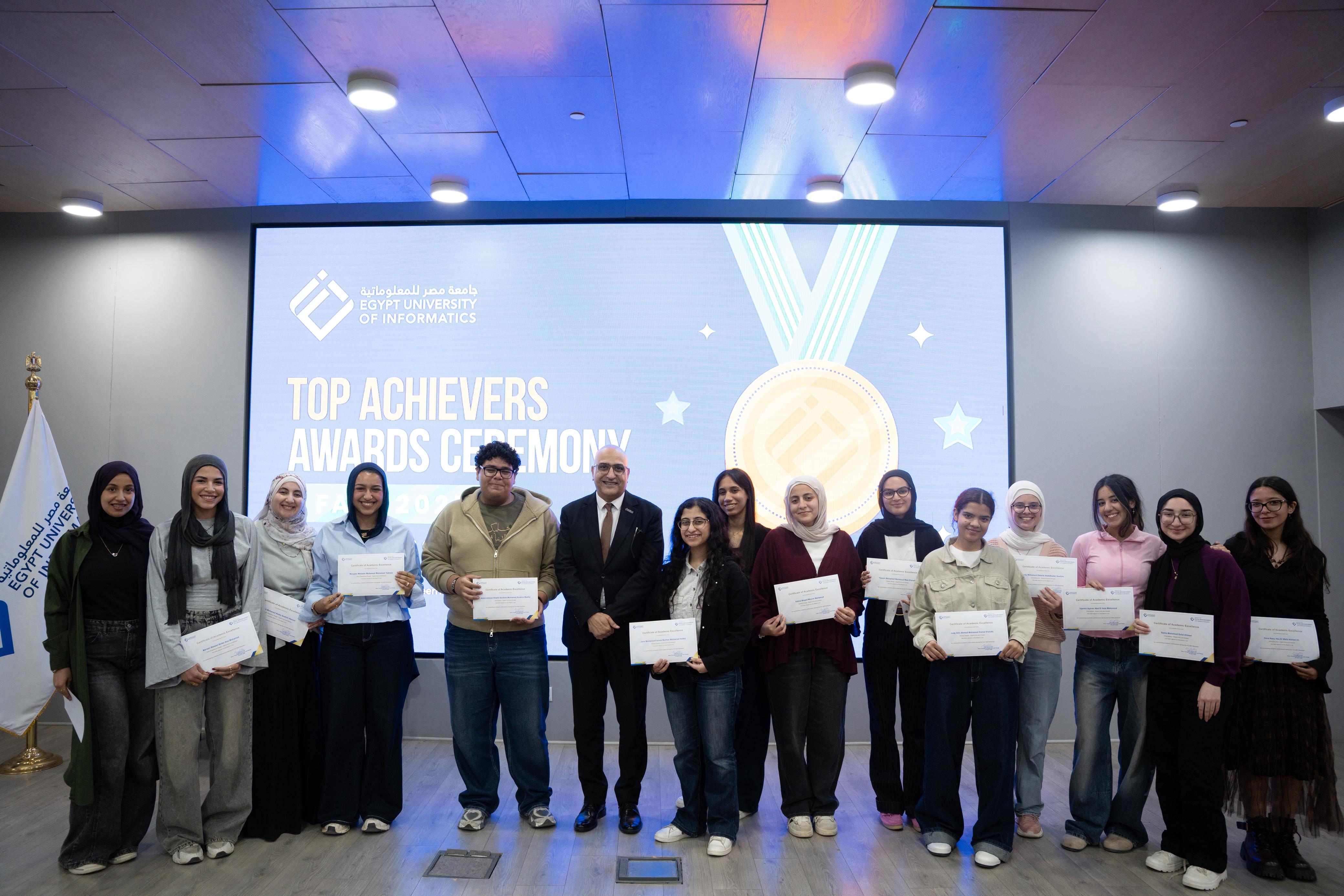 كرمت جامعة مصر للمعلوماتية 72 طالب وطالبة أوائل الفرق الدراسية المختلفة بكلياتها الأربع وذلك خلال احتفالها بيوم المتفوقين في الفصل الدراسي الأول للعام الدراسي 2025/2026، وأقيم الاحتفال بمقر الجامعة في مدينة المعرفة بالعاصمة الإدارية الجديدة.