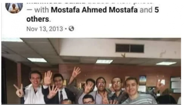 كشف صورة للدكتور محمود طارق الذى اثار أزمة تقديم استقالته بتحريض زملائه بمستشفى المنيرة اثناء رفع علامة رابعة الاخوانية بالاضافة الى توجيه السباب والشتائم الى الدولة المصرية ومؤسساتها.