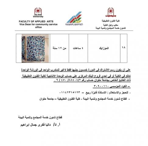 ينظم قطاع خدمة المجتمع وتنمية البيئة بكلية الفنون التطبيقية بجامعة حلوان، ورش الفنية لليوم الواحد للأطفال والشباب والطلائع، والتى تقام فى إجازة اخر العام 2019 / 2020 وذلك برعاية الدكتور ماجد نجم رئيس الجامعة.