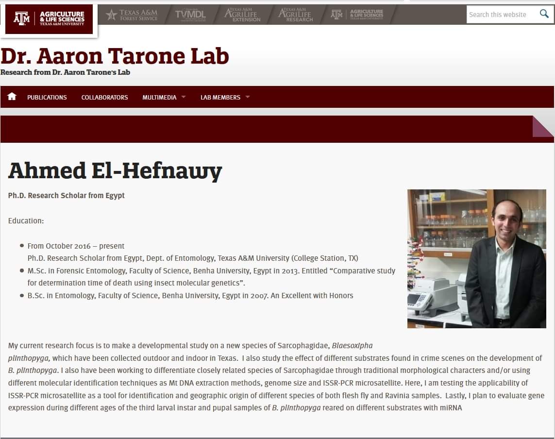 مشيرا بقوله : أنه كان يعمل على ٣ مشاريع بحثية تابعة لوزارة العدل الأمريكية بخصوص موضوع حشرة جديدة دخلت بيئة ولاية تكساس ولم يعرف العلماء انذاك عن دورة حياتها اى شىء ونجحت في ذلك وتم الإشادة بي وبابحاثي وتم نشرها في الولايات المتحدة الأمريكية في دوريات علمية من الدرجة الأولى Q1 .