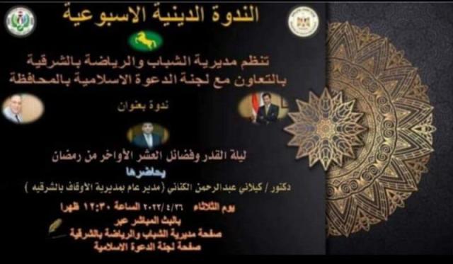 أوضح وكيل وزارة الشباب والرياضة أنه من المقرر أن يقوم فضيلة الشيخ كيلاني عبد الرحمن الكناني مدير عام بمديرية أوقاف الشرقية وعضو لجنة الدعوة الإسلامية بالمحافظة بتقديم الندوة والتي سوف يتحدث فيها فضائل العشر الأواخر من رمضان واهم الأعمال التي يجب أن نقوم بها من الصلاه والتضرع والتقرب الي الله بالأعمال الصالحة وكذلك ضرورة تحري ليله القدر واحياؤها فهي خير من الف شهر ويكون ذلك بالصلاة والقرآن والذكر والاستغفار، والدعاء من غروب الشمس إلى طلوع الفجر.