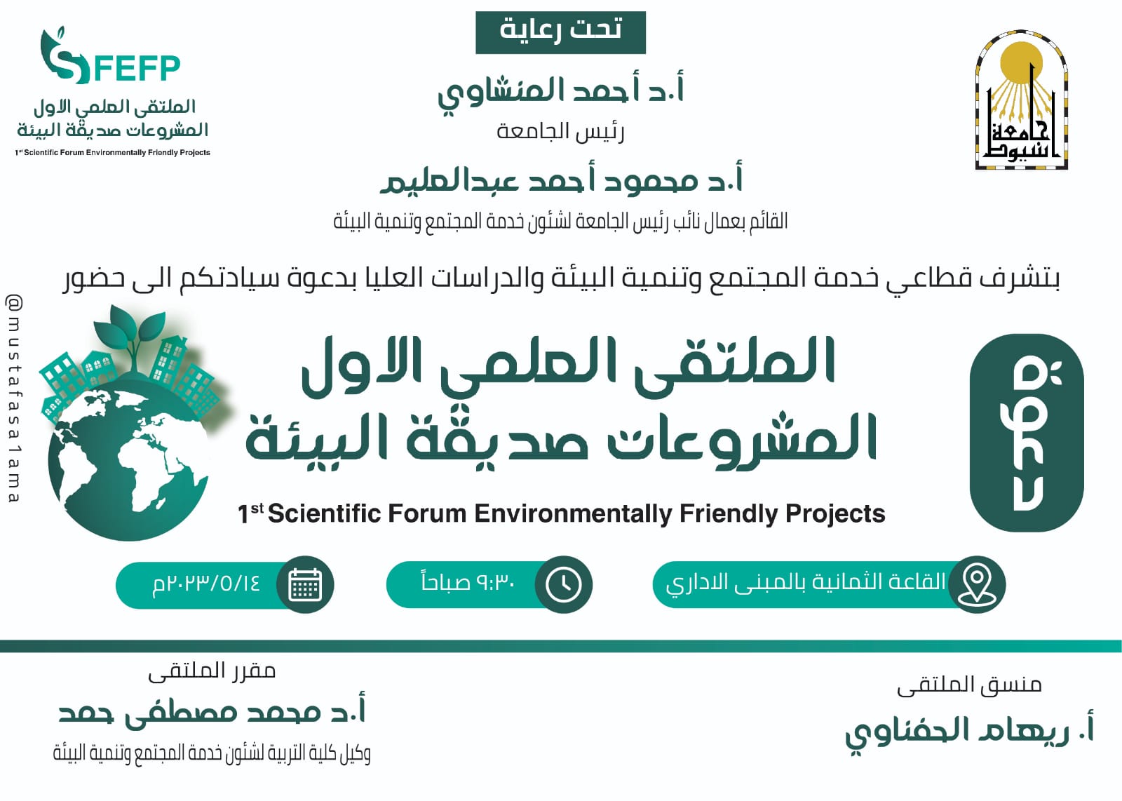 أعلن الدكتور أحمد المنشاوي رئيس جامعة أسيوط، عن تنظيم الملتقى العلمي الأول للمشروعات صديقة البيئة، والمنعقد بالتعاون بين قطاعي خدمة المجتمع وتنمية البيئة والدراسات العليا، الأحد ١٤ مايو٢٠٢٣.