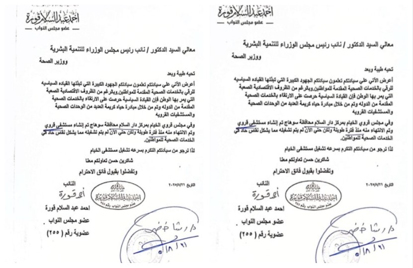 وختم " قورة " مذكرته مطالبًا بـالإسراع في إصدار قرارات تشغيل كل من مستشفى الخيام والوحدة الصحية بأولاد سالم بحري، مشيرًا إلى أن تشغيل هذه المنشآت سيمثل نقلة نوعية في الخدمات الطبية لأهالي مركز دار السلام، وسيسهم في تخفيف العبء عن كاهل الأسر البسيطة التي تضطر لقطع مسافات طويلة بحثًا عن العلاج.