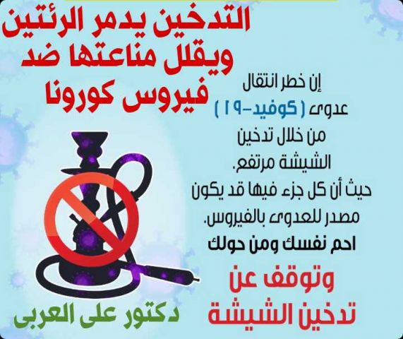 حذر الدكتور على حسن العربى استشارى الباطنة والقلب والصدر وعضو الجمعية المصرية لدراسة امراض الجهاز الهضمي والكبد من أضرار التدخين بصفة عامة واضرار تدخين الشيشة لصفة خاصة حيث أكد العربى أن الشيشة تضعف الجهاز المناعى للجهاز التنفسى وخاصة الرءيتبن لأنهما إذا ما كانت المناعة ضعيفة فيهما فأصبح فيروس كورونا