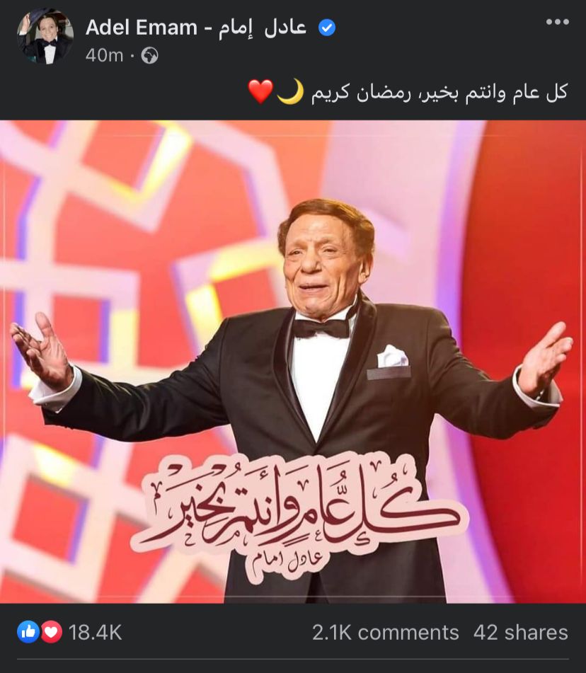 ونشر الزعيم عادل إمام، صورة له، عبر حسابه الشخصي بموقع التواصل الاجتماعي فيسبوك، وكتب قائلًا: كل عام وأنتم بخير رمضان كريم.